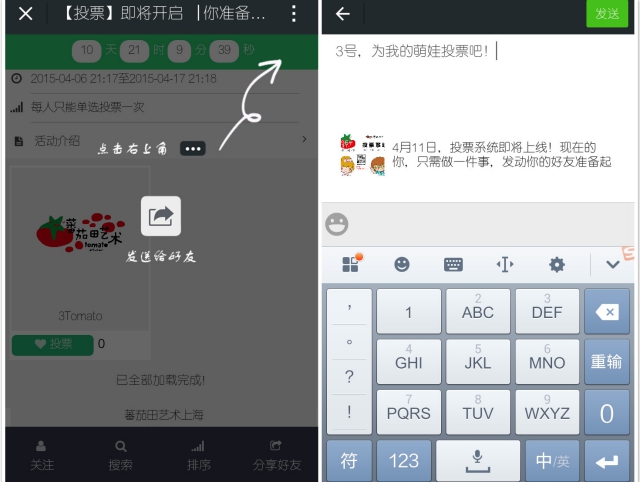 1、分享朋友进行拉票,每位朋友有一次投票机会,每次投票加1分。